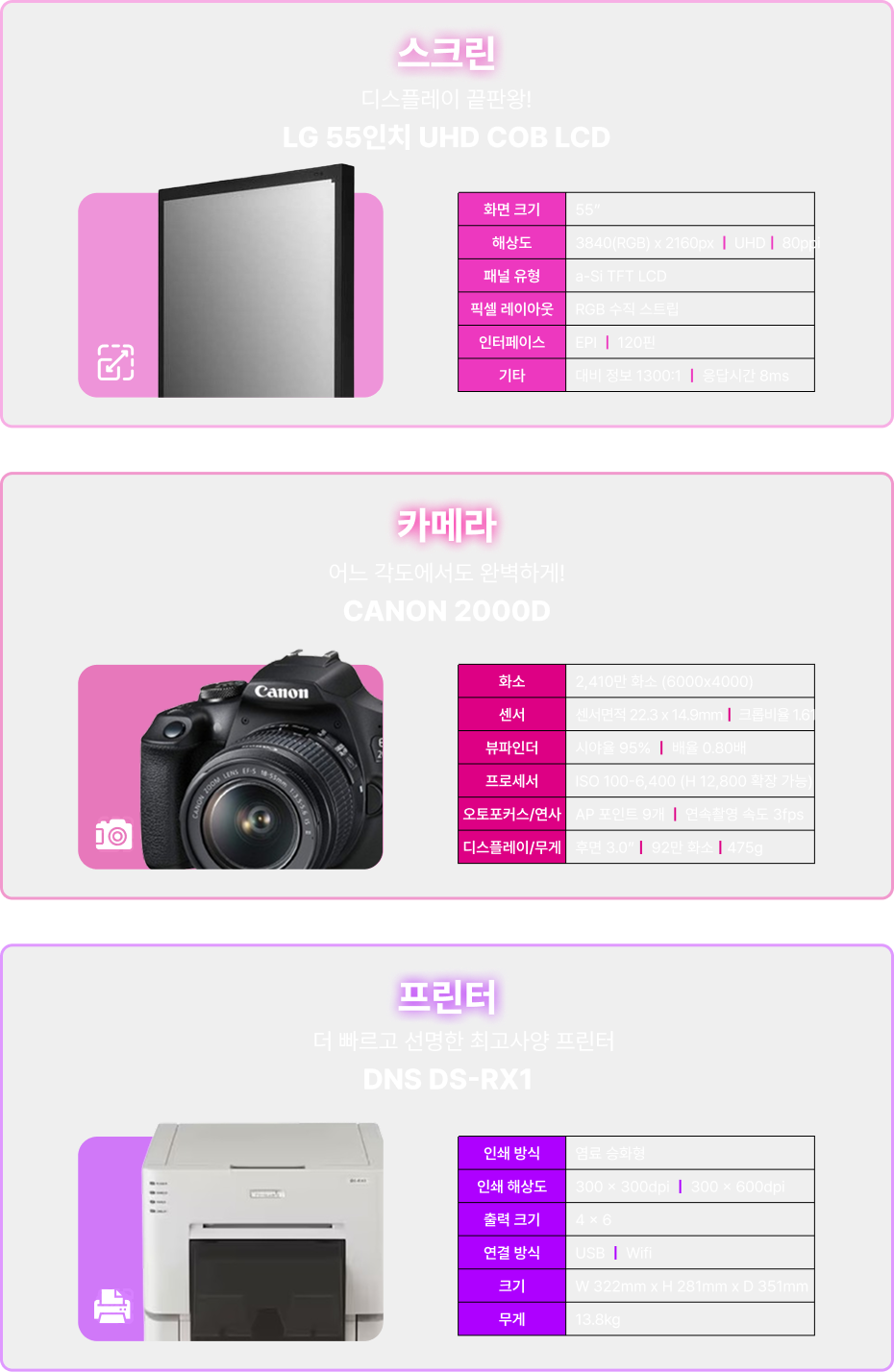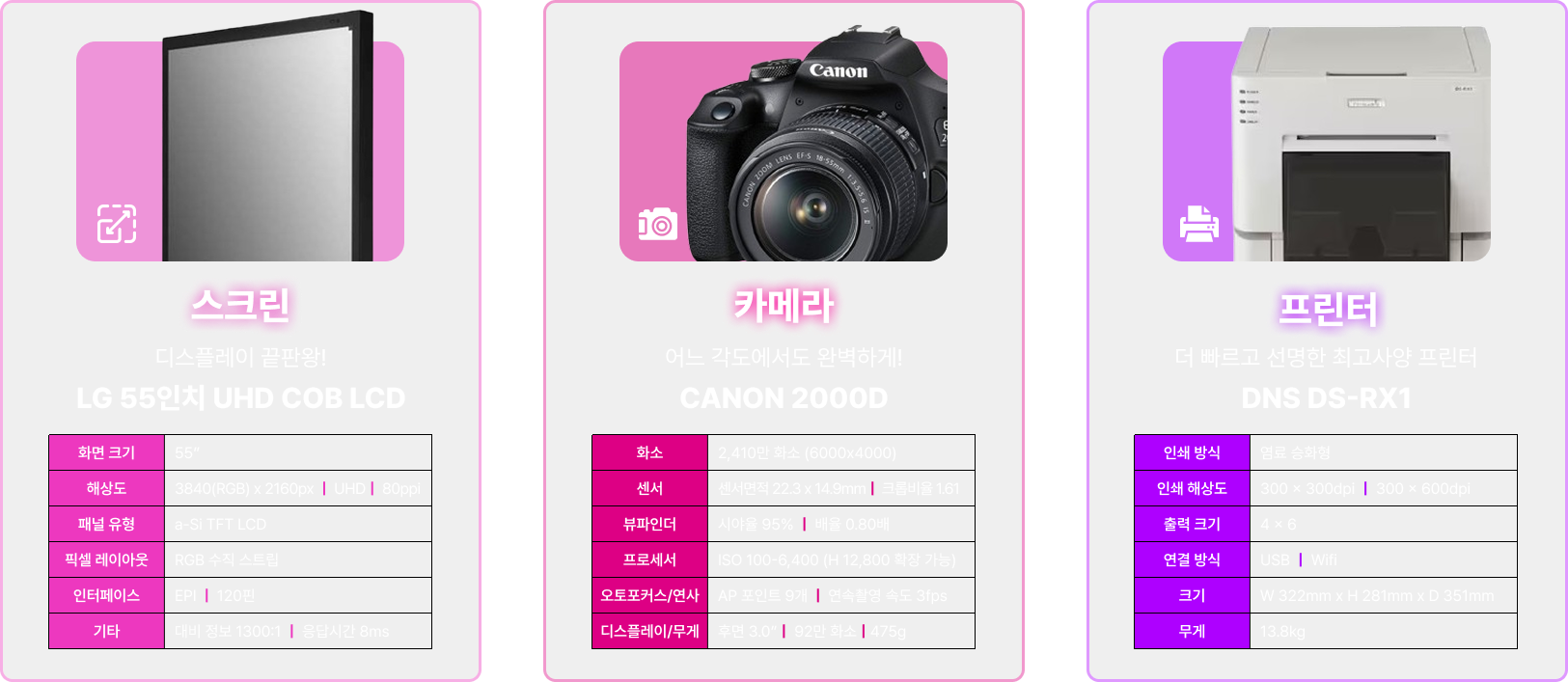 | 구분 | 미러부스 네온 | 미러부스 클래식 | 미러부스 헐리우드 | 미러부스 플라워 | 아이패드 부스 | 우드 미러부스 | 우드 포토부스 | 우드 심플부스 |